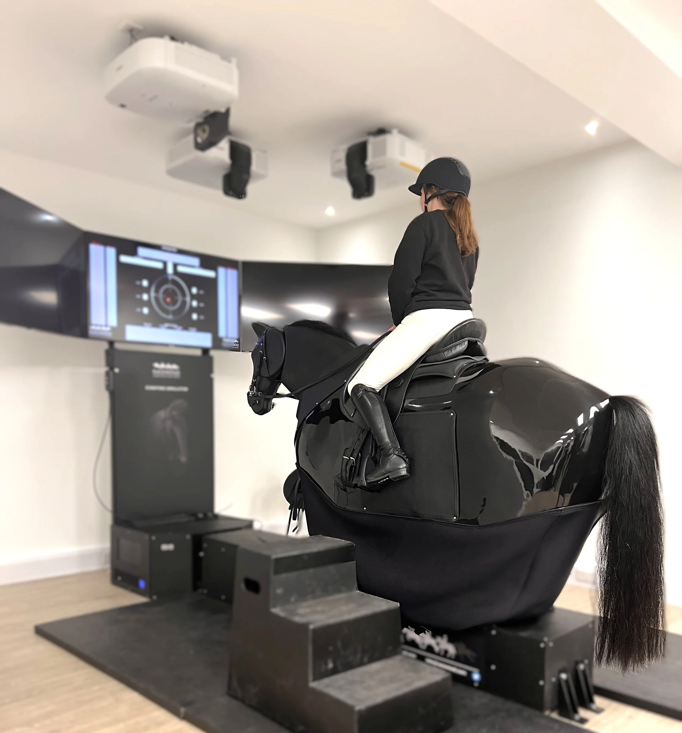 Experience the Racewood Eventing Simulator — capable of Grand Prix dressage movements, jumping grid work, and cross-country course challenges.